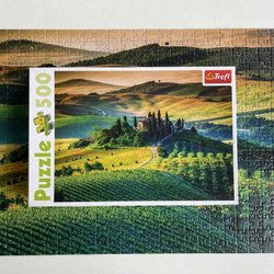 Äldre pussel med grönt landskapsmotiv. Svårt pga det enformiga motivet, så passar någon som vill ha en utmaning!