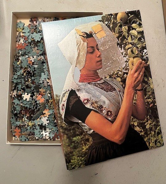Ett pussel med motiv en kvinna klädd i traditionell holländsk dress. 1000 bitar.