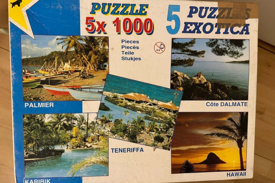 Puzzle 5x1000 med motiver fra Palmiet, Karibik, Teneriffa, Côte Dalmate og Hawaii.