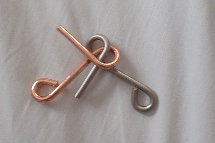 Ett iq pussel i koppar och silverfärgade metaller. Pusslet består av två sammankopplade delar.