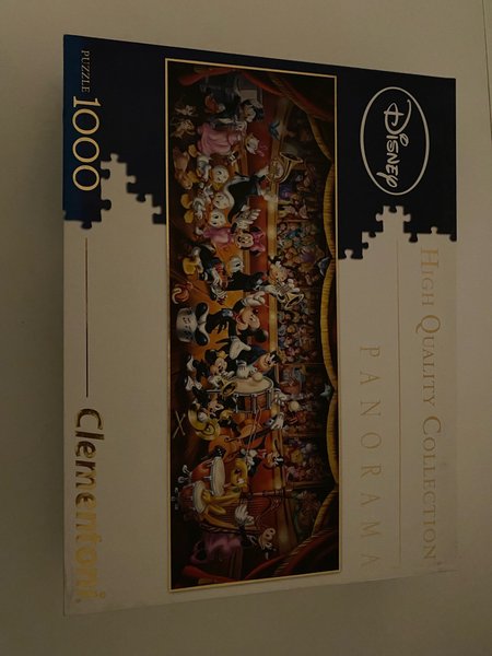 Pussel från Clementoni med Disney-motiv. Pusslet har 1000 bitar och är i panoramaformat. Pusslet är byggt en gång.