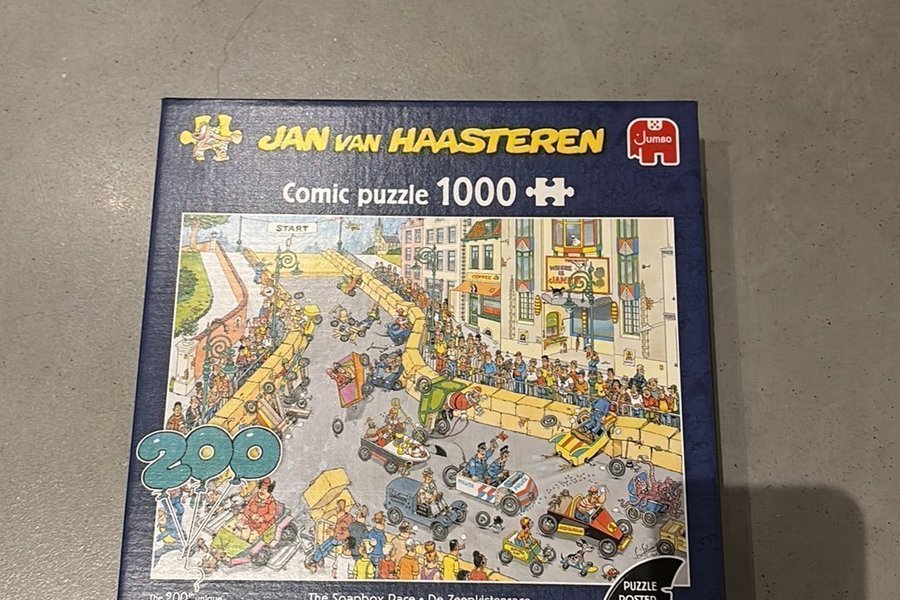 Jan Van Haasteren pussel. Motivet heter The Soapbox Race. Pusslet innehåller en affisch.