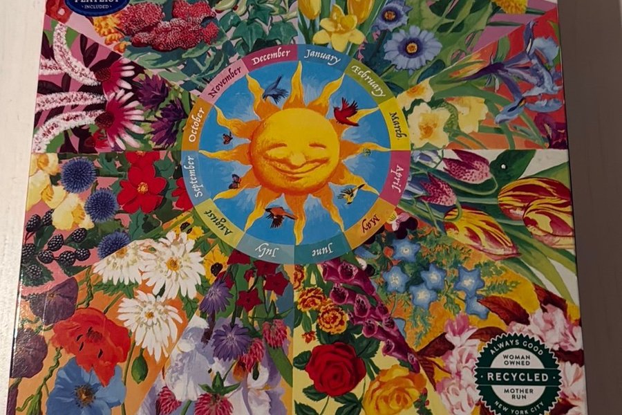 Pussel med 1000 bitar från eeBoo. Motivet är en blomkalender med en sol i mitten och olika blommor för varje månad. Komplett