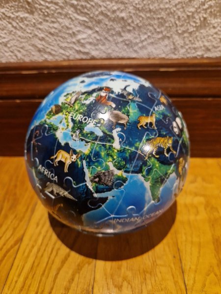Ett roligt pussel i form av en jordklot med djur. Står på en liten plattform.
