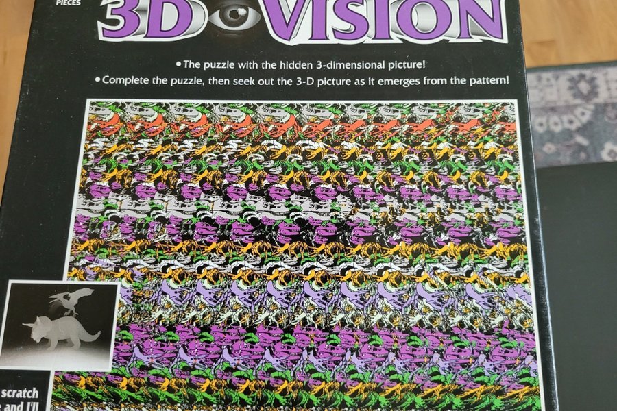 Ett 3D-pussel. När pusslet är färdigt kan du försöka se den dolda 3D-bilden som framträder i mönstret.