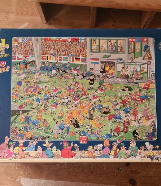 Jumbo pussel med motiv av en fotbollsmatch. Pusslet har 1000 bitar.