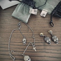Vit fakeskinn väska med fransar och ett kors med dödskallar på framsidan. Väskan har en justerbar axelrem och är dekorerad med nitar. Inköpt på Amazon
