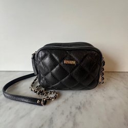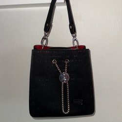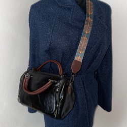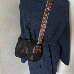 Svart axelremsväska med justerbar axelrem i brunt med mönster. Väskan har ett fack med dragkedja.