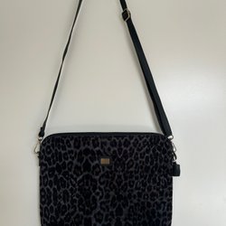 Gul väska med svart kant och axelrem. Väskan har ett fack som stängs med dragkedja.