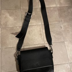 Svart axelremsväska med lock. Väskan har en justerbar axelrem och en liten Carin Wester-logotyp på framsidan. Inuti finns ett fack med dragkedja och en liten ficka.