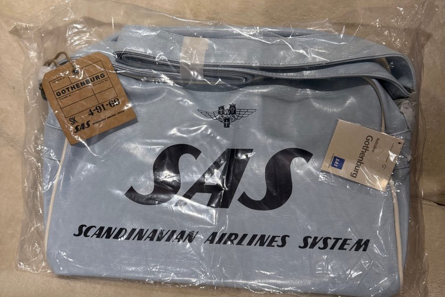 En ljusblå väska med texten "SAS SCANDINAVIAN AIRLINES SYSTEM" tryckt på framsidan. Väskan har en axelrem och en bagagetag med texten "GOTHENBURG SK 4-91-69".