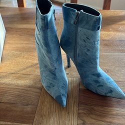 Denimfärgad väska med quiltat mönster och silverfärgade detaljer. Väskan har en kedja som axelrem och stängs med ett spänne.