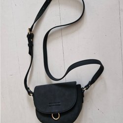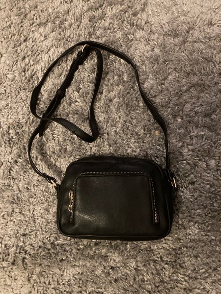 Svart axelremsväska med justerbar rem och en ficka med dragkedja på framsidan.