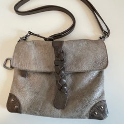 Skinnväska med axelrem, 23 cm hög, 20 cm bred. 2 fack med dragkedja inuti och ett fack med dragkedja bak.