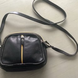 Lille sort taske med en justerbar skulderrem. Tasken har en klaplukning med en magnetisk knap og en lynlåslomme på bagsiden. Indvendigt er der et rum med lynlås.