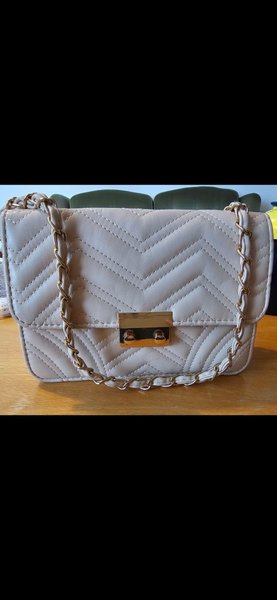 Väskan på bilden är en elegant axelväska i en ljus beige eller krämfärgad färg. Den har en rektangulär form med ett lock som stängs framtill med ett guldfärgat metallspänne. Materialet ser ut som läder eller konstläder och framsidan har ett dekorativt quiltat mönster i zigzag- eller chevron-stil. Väskan har en guldfärgad kedjerem där delar av kedjan är täckta med samma material som väskan för att göra den bekvämare att bära. Den kan bäras på axeln eller över kroppen. Stilen är klassisk och elegant och påminner om designen hos väskor från märken som Chanel. Väskan passar bra både till vardags och till finare tillfällen. ???