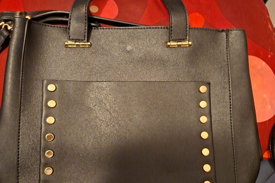 Svart handväska med guldfärgade nitar längs sidorna och guldfärgade detaljer vid handtagen. Väskan har ett huvudfack och en mindre ficka framtill.