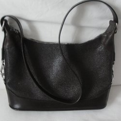 Brun handväska med handtag och axelrem. Väskan har en ficka med dragkedja på framsidan.