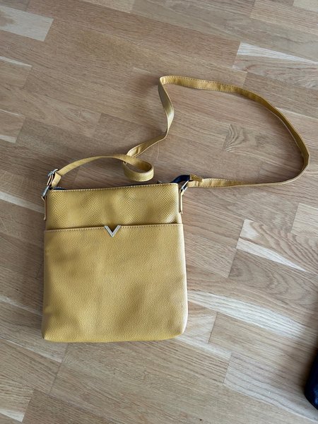 En senapsgul axelremsväska med en ficka på framsidan. Väskan har en silverfärgad detalj på fickan och en justerbar axelrem.