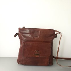 Brun läderväska med justerbar axelrem och dekorativa mönster. Väskan har ett spänne framtill och flera fack inuti.