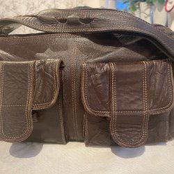 Brun väska från Vezzano med justerbar axelrem och ett handtag. Väskan har ett fack med dragkedja på baksidan och ett fack under locket på framsidan. Väskan stängs med ett spänne.