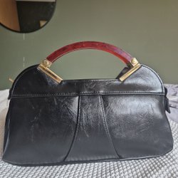 En svart axelremsväska i läder med croc-mönster från Åhléns. Stor öppen ficka fram och bak, två inre fack varav ett till för laptop stängs med blixtlås.
