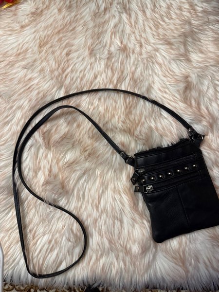 Svart liten väska med axelrem och flera fack med dragkedja. Väskan har dekorativa detaljer i form av nitar.