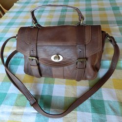 Brun handväska med ett handtag och en justerbar axelrem. Väskan har en rektangulär form med lock.