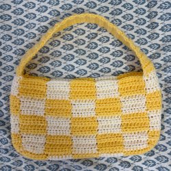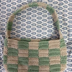 Handgjord virkad väska i ett schackrutigt mönster med blå nyanser. Väskan har ett kort handtag och är perfekt för att bära mindre föremål.