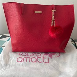 Röd handväska med både handtag och axelrem. Väskan har flera fack med dragkedja.
