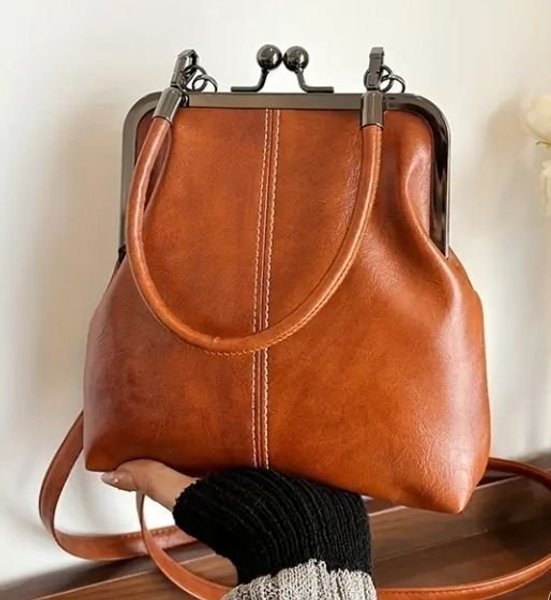 Brun handväska med metallspänne och handtag. Väskan har en justerbar axelrem.