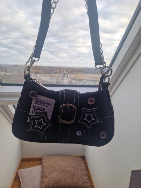 Svart väska med dekorativa detaljer som stjärnor och knappar. Väskan har ett spänne framtill och en axelrem med kedjedetaljer.