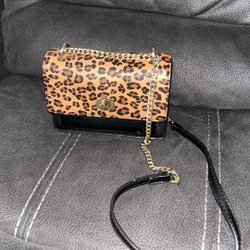 Fin väska med fusk leopardpäls. Axelband med kedja. Fack med dragkedja inuti. Stängs med magnet.