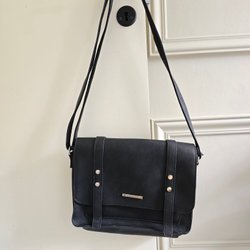 Svart axelremsväska med justerbar rem. Väskan har flera fack med dragkedja.