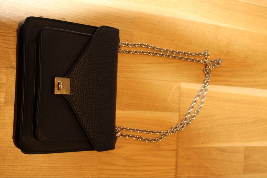 Svart handväska med guldfärgad kedja. Väskan har ett lock med ett guldfärgat spänne.