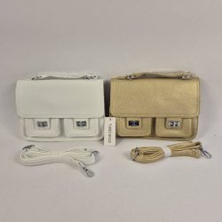 Elegant vit handväska med silverfärgad detalj. Väskan har ett lock med magnetlås och en justerbar axelrem. Inuti finns ett rymligt fack och en mindre ficka med dragkedja.