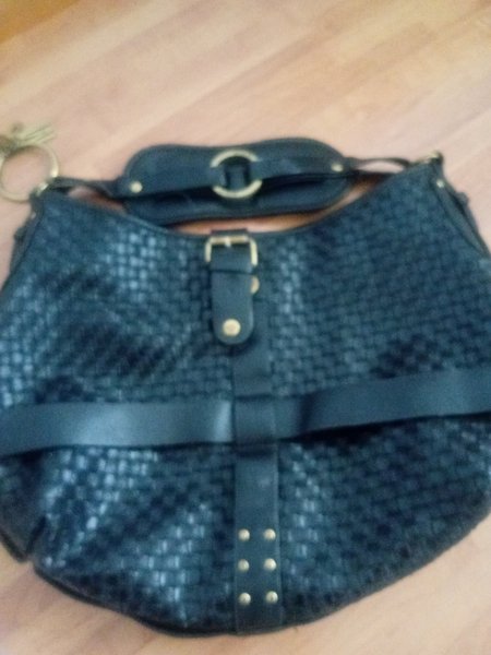 Svart vävd handväska med justerbar axelrem och dekorativa detaljer i form av spännen och nitar.