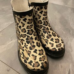 Väskrem i orange och svart med leopardmönster och detaljer i guldfärg. Remmen har svarta läderdetaljer och guldfärgade spännen.