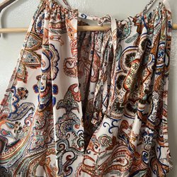 Väska med ett iögonfallande mönster i grönt, orange och andra förget. Den har en guldfärgad kedja och stängs med magnetlås. Insidan är fodrad och har en liten ficka med dragkedja.