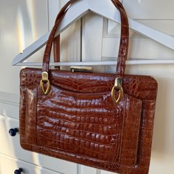 Brun handväska med två handtag. Väskan har ett fack på framsidan och en dragkedja upptill. Insidan har flera fack, inklusive ett med dragkedja.