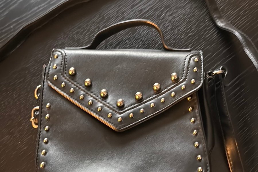 Svart väska med axelrem och handtag. Väskan har dekorativa nitar.