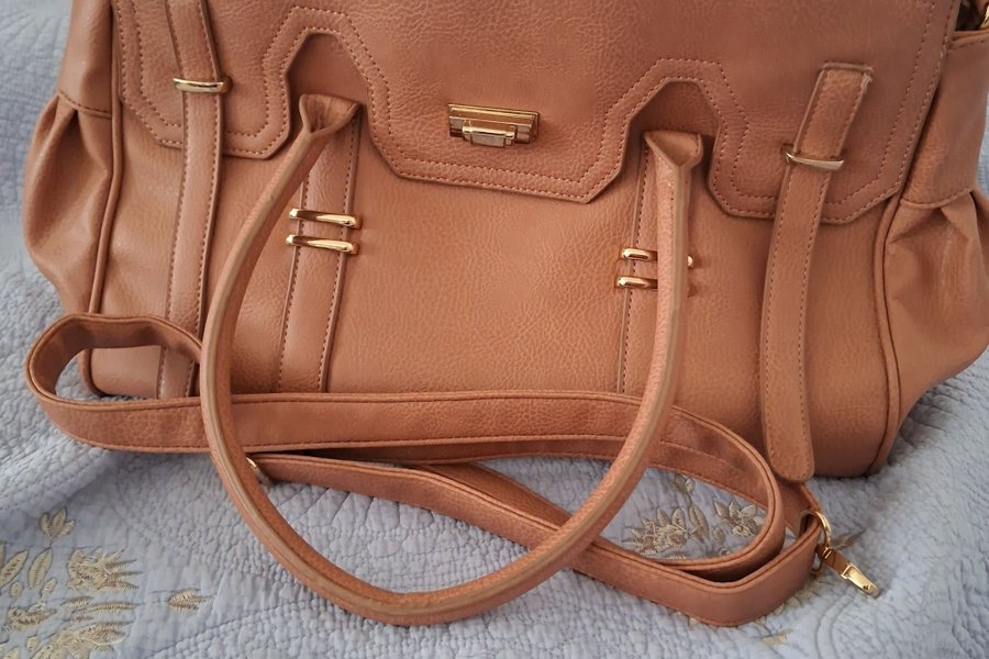 Rymlig handväska syntet från England. 1st fack med dragkedja och 1st öppet på insidan.