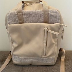 Brun handväska med två handtag, en ficka med lock framtill och en dragkedjeficka ovanför. Väskan har även en dragkedja upptill för att stänga den.