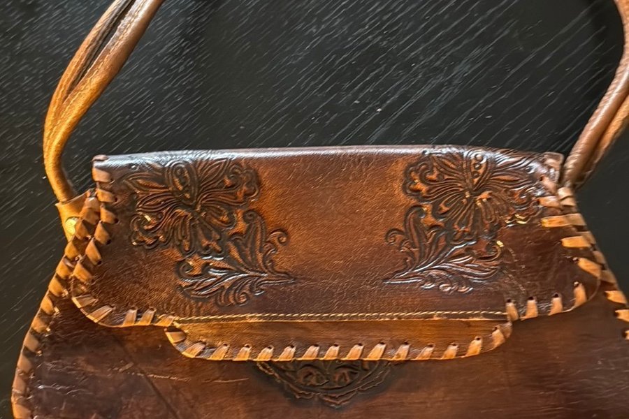 Brun handväska med axelrem. Väskan har ett präglat blommönster och dekorativa sömmar.