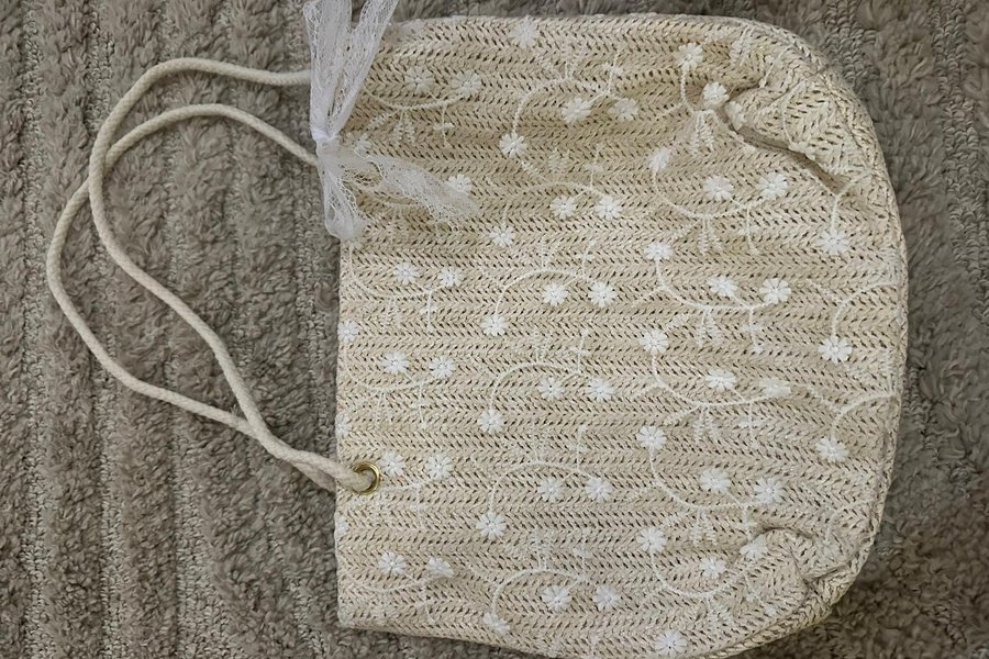Väska med dragskoöppning. Väskan har ett mönster av små vita blommor och bladverk över hela ytan. Dragskon är av ett tvinnat snöre i naturfärg, och det finns en liten vit spetsrosett fäst vid dragskon.