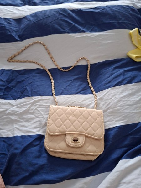 En söt, ljusbeige väska med quiltat mönster och en guldfärgad kedja som axelrem. Väskan har ett litet lock med ett spänne.