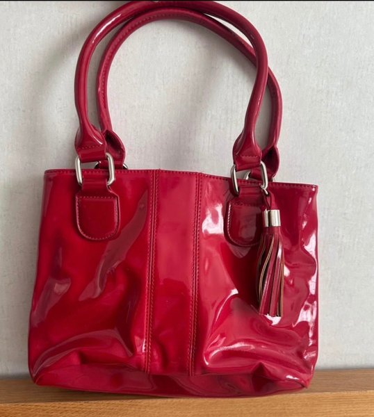 Elegant röd handväska med dubbla handtag och en dekorativ tofs. Väskan har en blank yta och en klassisk design.