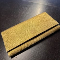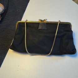 Väskan har ett guldfärgat knäppe och en axelrem. Insidan är fodrad och har flera fack för förvaring.