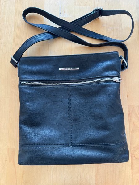 Handväska i läder 26x26x4cm i storlek. Dragkedja ovan till huvudfacket och en dragkedja framtill. Innerficka finnes för exempelvis nycklar.