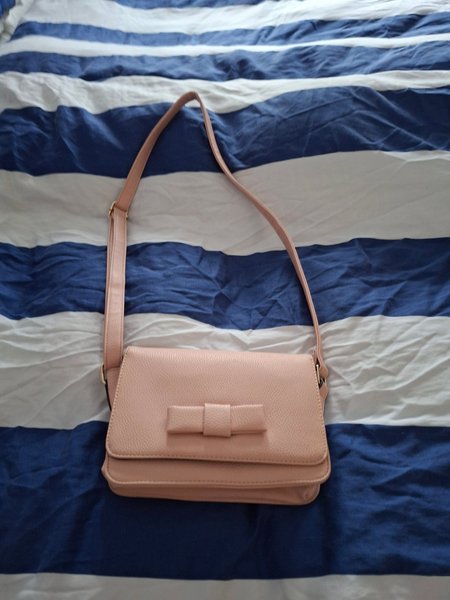 En söt, ljusrosa handväska med axelrem och dekorativ rosett framtill. Väskan har en klassisk design.